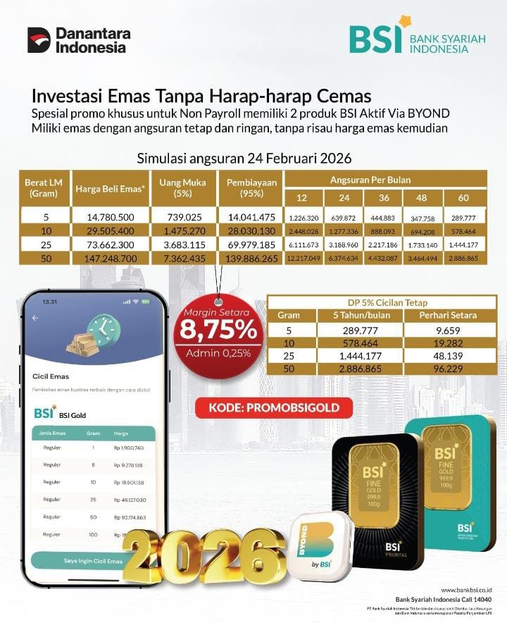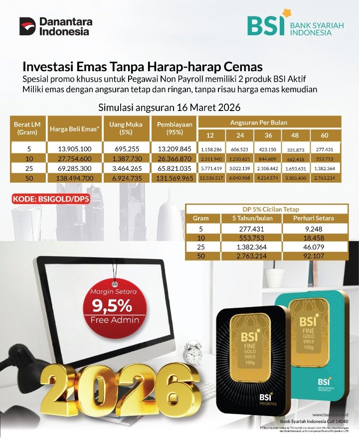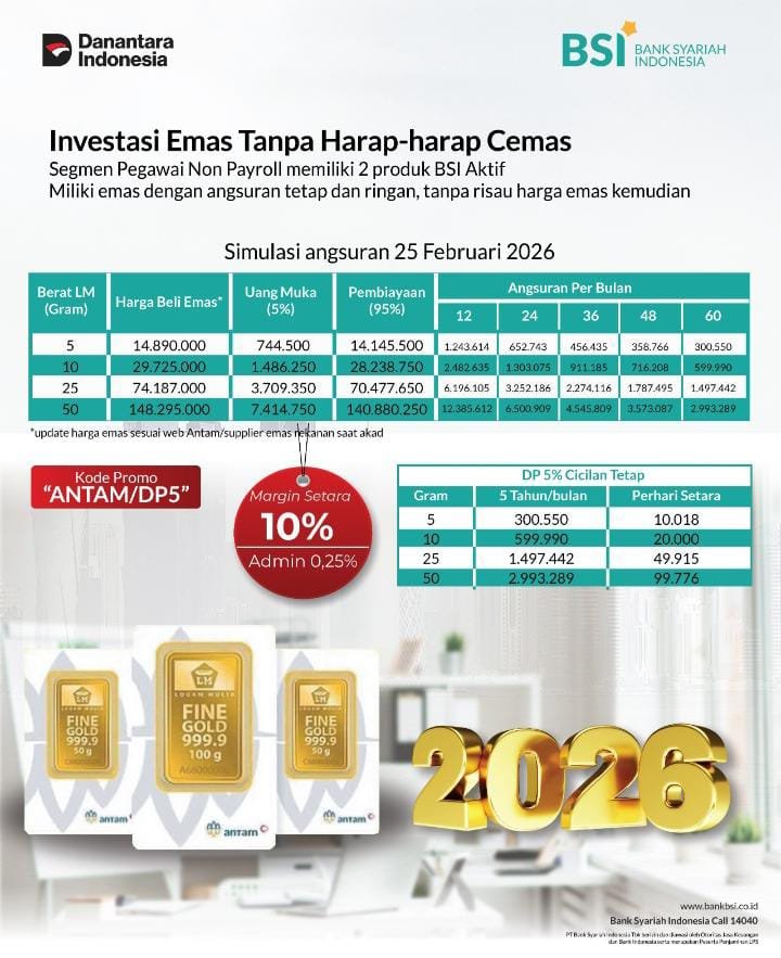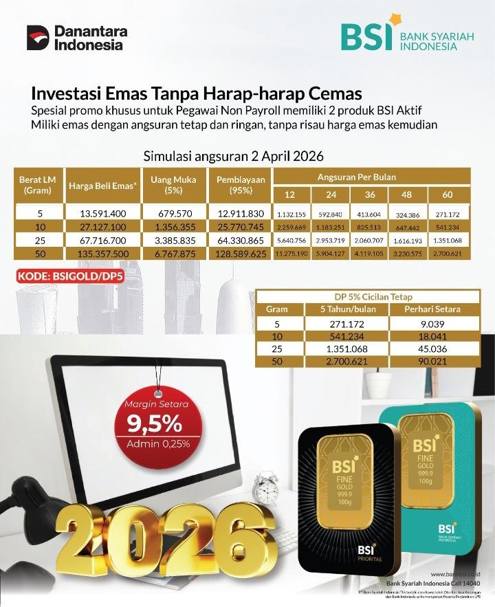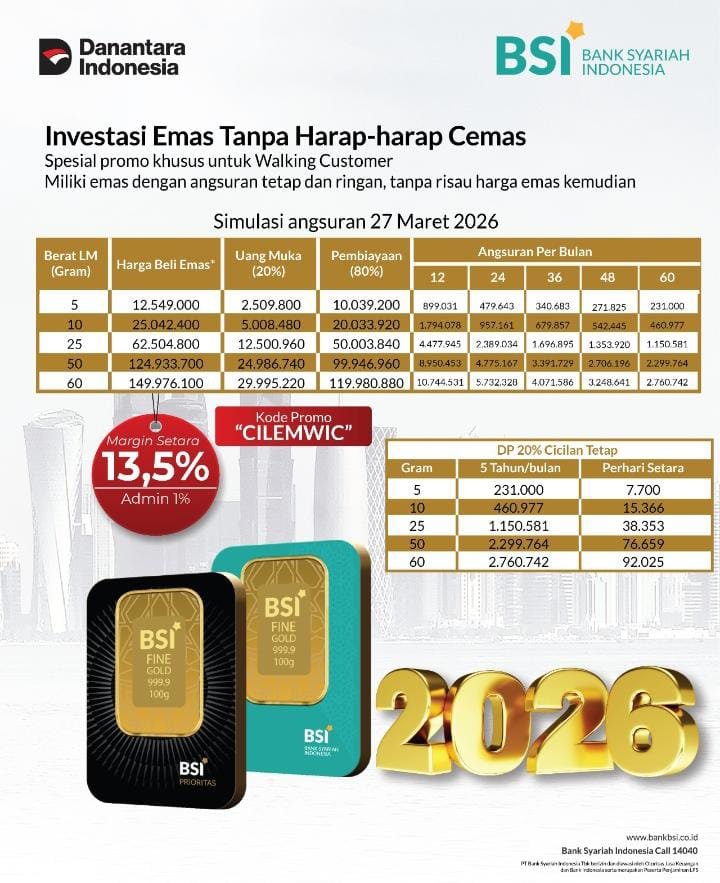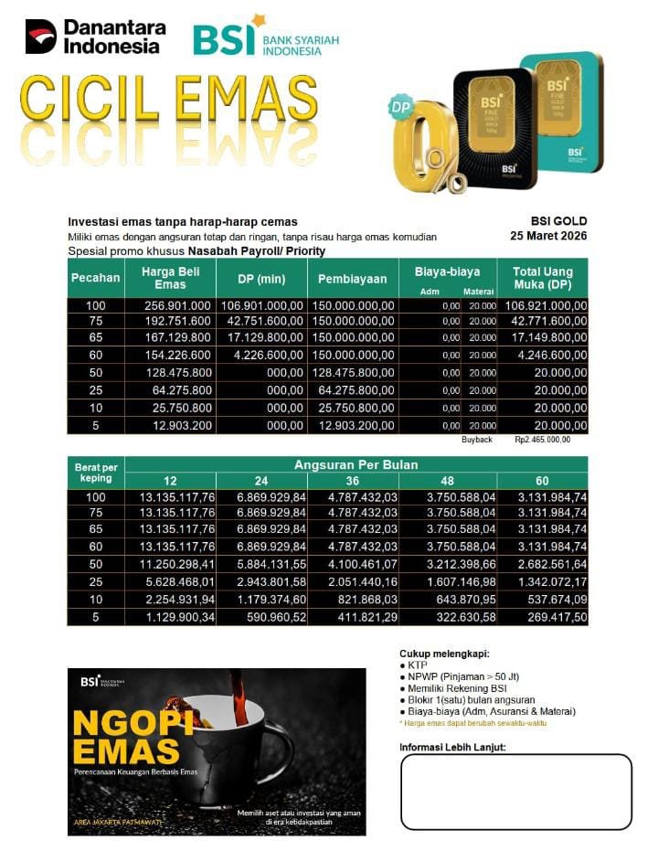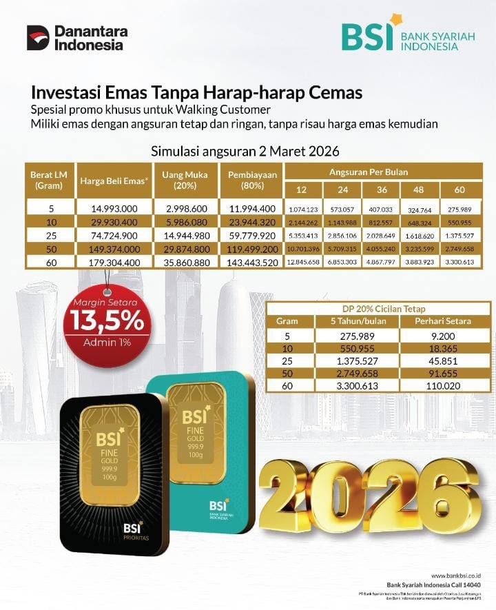 SEJARAH HARGA CICILAN FAQ Cicilan Emas BSI Gold Hari Ini Supaya punya emasnya banyak, belinya dicicil saja di BSI. Punya uang muka Rp7.500.000 bisa nyicil dan punya emas 50 gram! Cicilan Emas BSI Gold Tanggal 2 April 2026 Cicilan Emas BSI Gold Tanggal 27 Maret 2026 Cicilan Emas BSI Gold Tanggal 26 Maret 2026 Cicilan Emas BSI Gold Tanggal 25 Maret 2026 Cicilan Emas BSI Gold Tanggal 17 Maret 2026 Cicilan Emas BSI Gold Tanggal 16 Maret 2026 Cicilan Emas BSI Gold Tanggal 13 Maret 2026 Cicilan Emas BSI Gold Tanggal 12 Maret 2026 Cicilan Emas BSI Gold Tanggal 11 Maret 2026 Cicilan Emas BSI Gold Tanggal 9 Maret 2026 Cicilan Emas BSI Gold Tanggal 6 Maret 2026 Cicilan Emas BSI Gold Tanggal 4 Maret 2026 Cicilan Emas BSI Gold Tanggal 3 Maret 2026 Cicilan Emas BSI Gold Tanggal 2 Maret 2026 Cicilan Emas BSI Gold Tanggal 27 Februari 2026 Cicilan Emas BSI Gold Tanggal 26 Februari 2026 Cicilan Emas BSI Gold Tanggal 25 Februari 2026 Cicilan Emas BSI Gold Tanggal 24 Februari 2026 Cicilan Emas BSI Gold Tanggal 23 Februari 2026 Cicilan Emas BSI Gold Tanggal 20 Februari 2026 Cicilan Emas BSI Gold Tanggal 19 Februari 2026 *** Navigasi pos Harga Emas BSI Gold Hari Ini Panduan Lengkap Cicil Emas di Aplikasi BYOND BSI